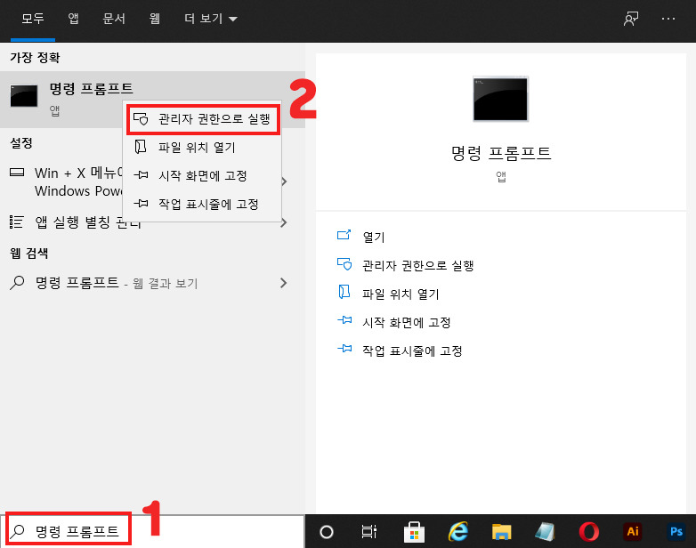 1. 윈도우 검색창에 CMD 명령 프롬프트 검색하여 '관리자 권한으로 실행'