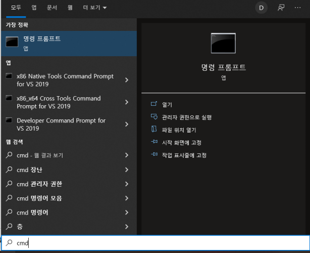 - 시작 검색에서 cmd 검색해서 찾으편 간편