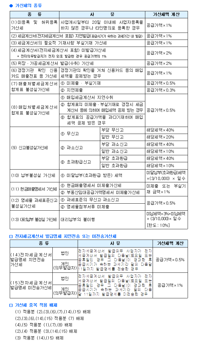 부가세의 경우, 기간내에 신고를 마치지 않거나 내야할 세금을 내지않는 경우 등 제대로 신고납부하지 않거나 불성실 행위에 대해서는 가산세라고 하여 패널티성의 세금이 부과됩니다. 때문에, 기간내에 제대로 신고납부해야 합니다.