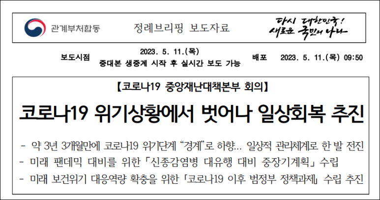 약 3년 3개월만에 코로나19 위기단계를 경계로 하향한다는 이야기였고, 지난 발표에서도 일상으로 돌아가겠다고 했는데요.