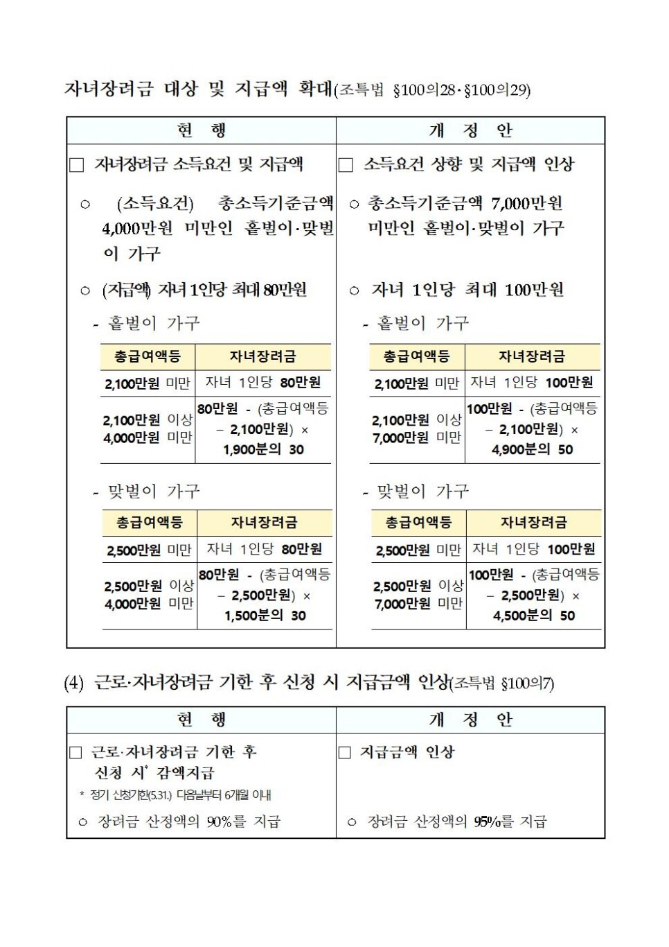위 지급요건은 2023년 자녀장려금 지급대상인 총 소득기준 금액 4,000만원에 비해 약 170% 상향된 수치입니다.